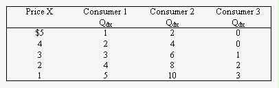 Given the following individuals' demand schedules for product X, and assuming these are the only three consumers of X, which set of prices and output levels below will be on the market demand curve for this product?